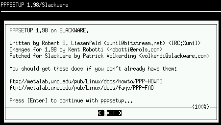 | En Slackware se incluye un programa llamado pppsetup para configurar tu sistema con tu cuenta de acceso telefónico. Su apariencia y funcionamiento son similares al programa netconfig.